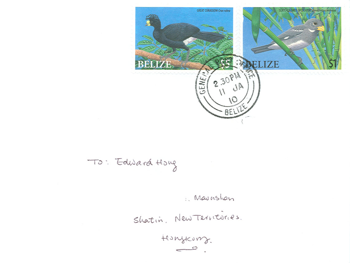 In last July, Belize issued a set of stamps illustrate five endangered birds, I specially sent a note to Belize Post to buy one set. However as there have some mistake, my note is not enough to pay the stamps but they still kindly replied my letter. Here, is one of the returned mail from them, is affixed with two of this issue, Great Curassow and Slate-coloured Seedeater respectively. Males Great Curassow mainly in black colour, however females can be in three different looks. It measured in 18 to 92 cm long and weight in 4,8 kilogram, widely lives in the tropical rainforest of rthe ange of south Mexico to Columbia. Slate-coloured Seedeater is a common seedeater which is in grey colour with yellowish bill, widely live in subtropical and tropical low-land forests, from Mexico to Venezuela.